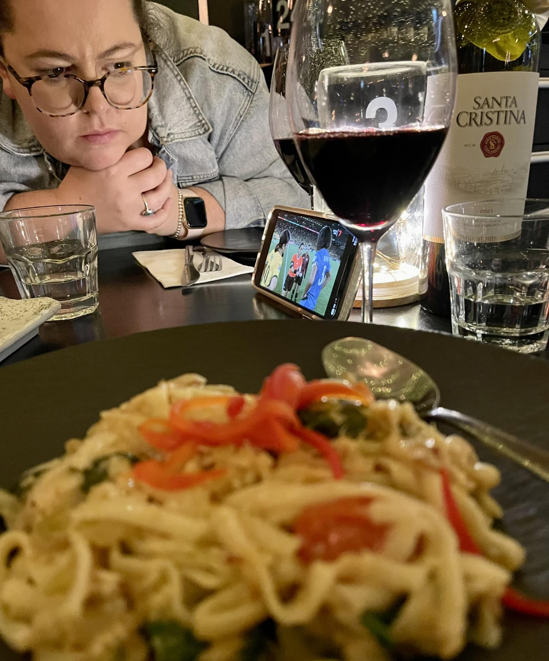 We were out at dinner and watched the penalty shoot-out as our (already overcooked) pasta got cold – we weren’t alone. Other diners paused, forks suspended, as cheers came from the Irish pub next door each time our girls kicked a goal or saved a French attempt. A few came and stood by our table.