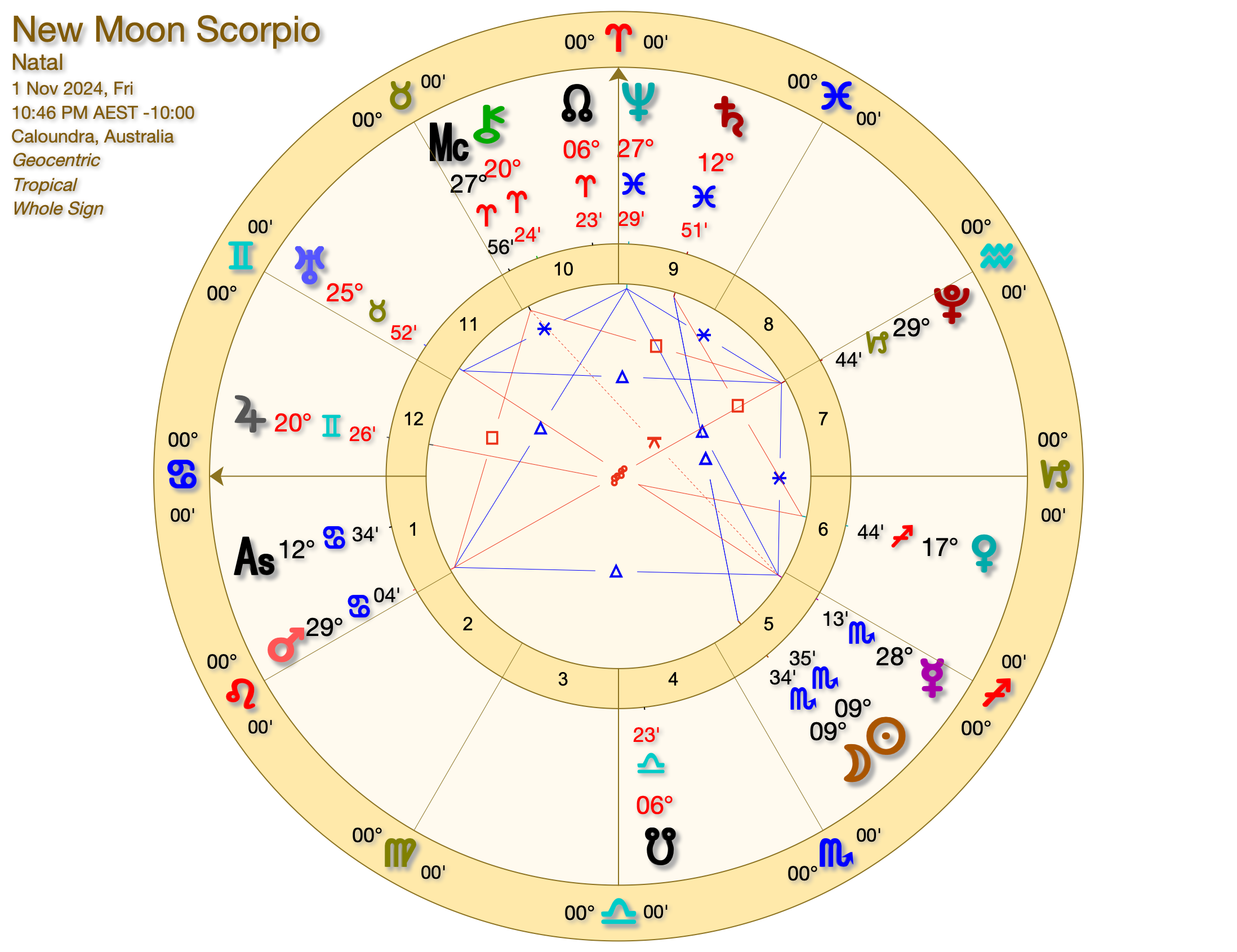 New Moon November 1, 2024, 10.46pm AEST 9 Scorpio 35
